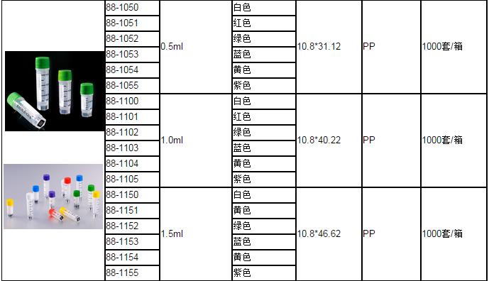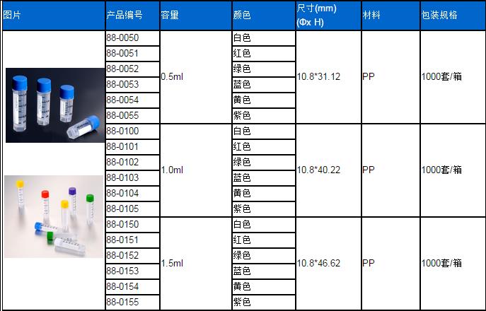 25 套冻存管/袋,20 袋/内盒,2 内盒/箱,1000 套冻存管/箱。