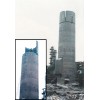 (2)施工人员立烟囱上,安全带挂在爬梯上后,用风镐、手锤由外向内将筒体逐块拆除,使碴块全由筒体内部落下;