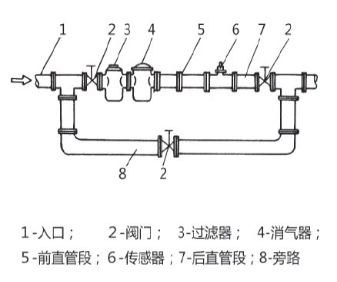 对旁通管的要求: 为了流量计检修时不影响介质的正常使用,在流量计的前后管道上应安装切断阀门(截止阀),同时应设置旁通管道。流量控制阀要安装在流量计的下游,流量计使用时上游所装的截止阀必须开,避免上游部分的流体产生不稳流现象。