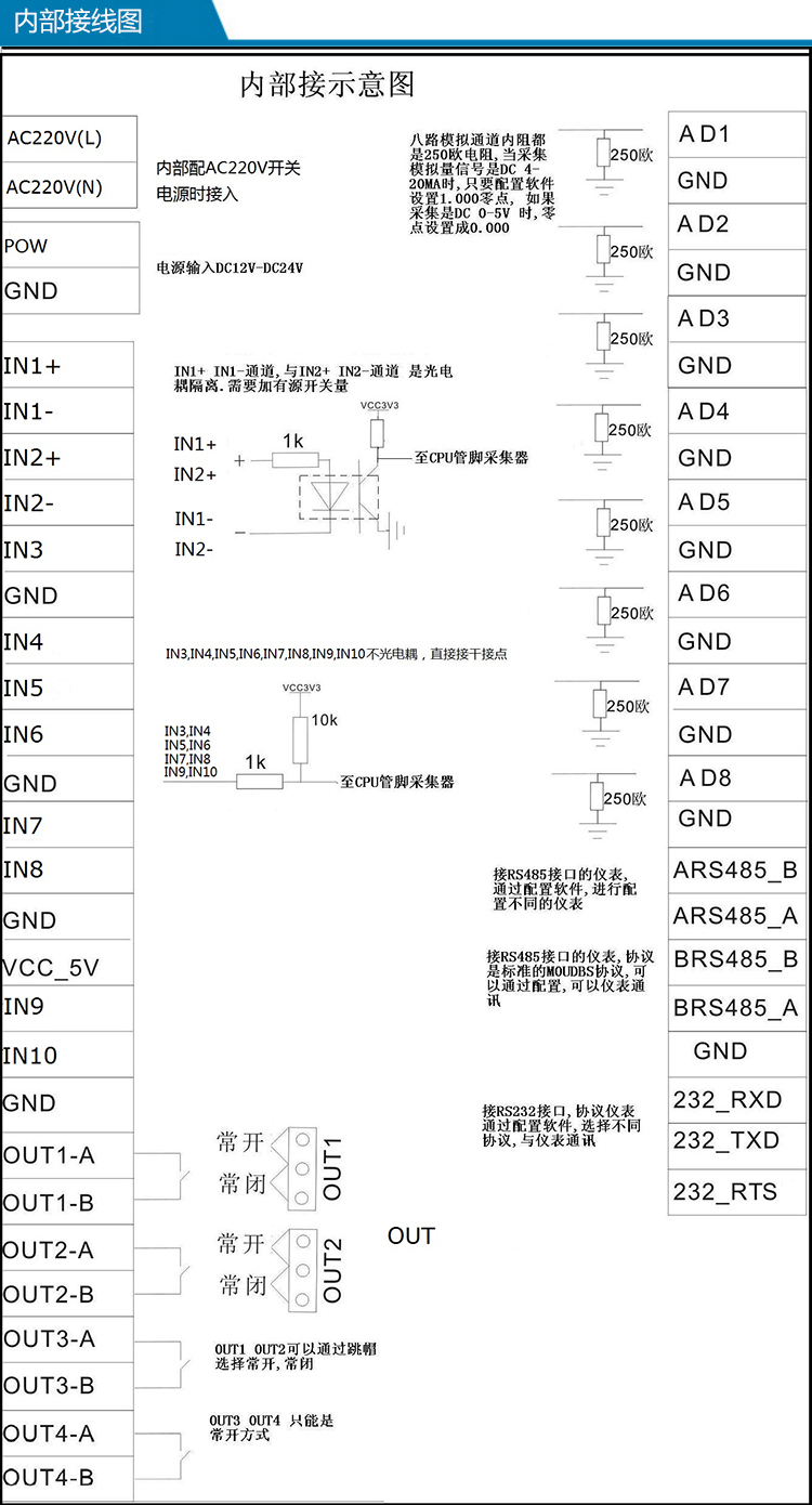模拟量输入阻抗为:250Ω,可以采集4~20mA,0~5V直流信号。