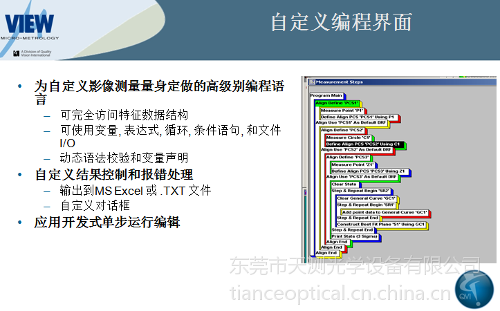 公司专业从事美国QVI产品、OGP影像测量仪,VIEW影像测量仪(中国区总代)、法国Keron 关节臂三坐标测量仪、等著名品牌测量仪器的销售、安装、维修、校正、保养、升级等服务。公司拥有完善的样品测试中心和方案评估实验室,可为客户提供完善的测量解决方案,公司附设200平米的机器展示中心,可为企业,学校及研究机构提供三维尺寸测量,三维激光扫描,测量仪应用培训等服务。
