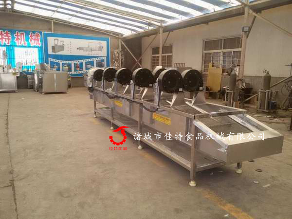 物料通过网带传输进入,经多次翻转,以实现物料的多面受风及受风的均匀性,通过吹风机的高压风力将食品冷却或将其表面水分吹干。风嘴成风刀状,有效的提高了风量压力,使物料表面的水分被吹走或蒸发,便于储藏和深加工。
