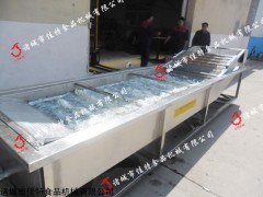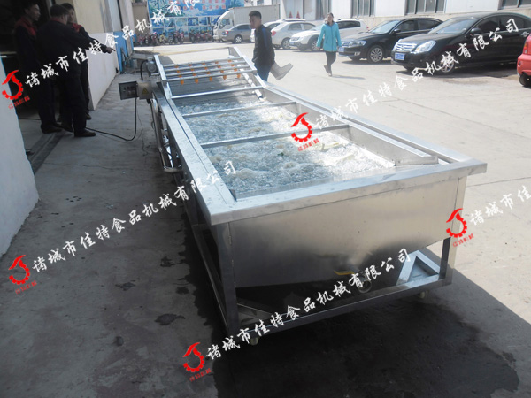 蔬菜清洗机工作时,洗槽中盛有清水,电机带动驱动滚筒使不锈钢网带运转,同时鼓风机也启动。被清洗的水果、蔬菜等物料防暑不锈钢网带的下水平段,在洗槽中,由于鼓风机送来的空气对水的剧烈搅拌作用,将蔬菜表面的污物冲洗掉,随时随着不锈钢网带的运动,蔬菜等物料被带到不锈钢网带的倾斜段,由喷淋管进行后一次清洗。此后进入上水平段修整检查后进入下道工序。