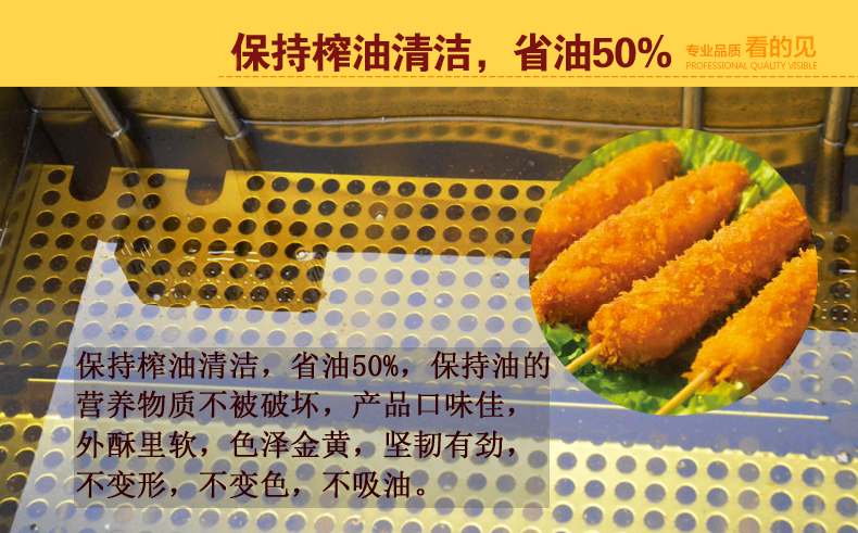 4、升温快:一锅油只需10分钟便加热到170度,且满负荷工作炸食品不会出现油温降低影响食品口感、色泽,浪费油等现象。