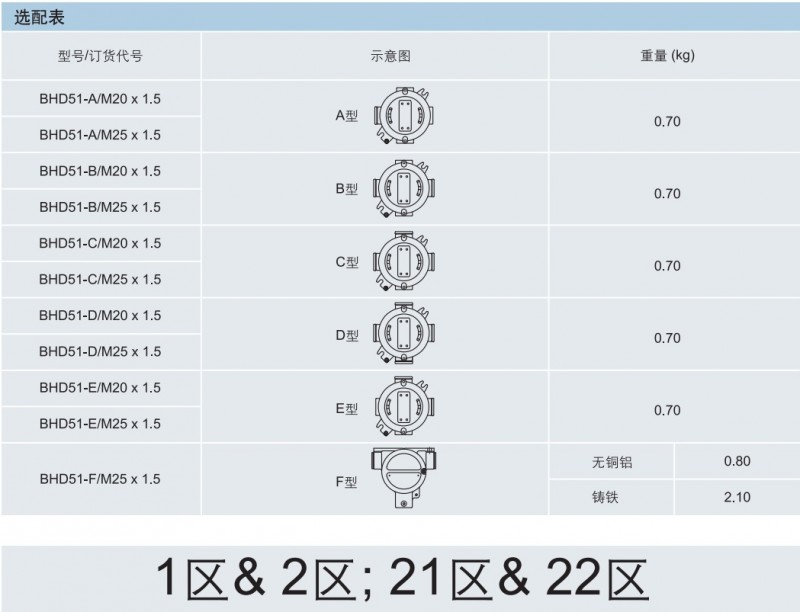 A、B、C、D、E型壳体只有无铜铝材质,F型壳体有无铜铝和铸铁两种材质