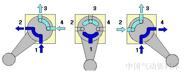 货VH400-02为SMC三位四通手动阀,具有四个气接口和三个作业方位。以圆盘式滑阀为例,其为三位四通式,驱动方法为手动或踏板式,通过滚动两个圆盘,各流道就可相互接通。当手柄停在中间方位时,进气孔1、出气孔2、4、排气孔3、均为关闭状况;顺时针滚动手柄45度时,进气孔1与出气孔2导通,出气孔4与排气孔3导通;逆时针滚动手柄45度时,进气孔1与出气孔4导通,出气孔2与排气孔3导通;