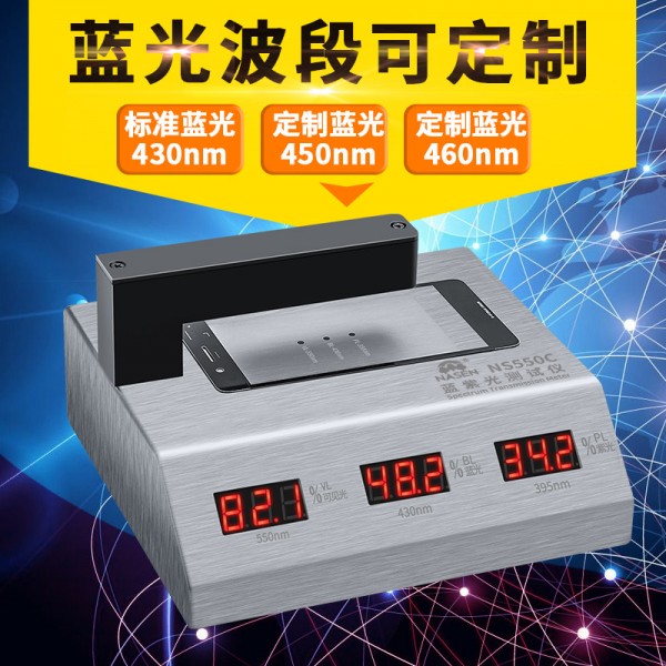 NS-550C防蓝光保护膜透光率测量仪,测试原理是采用紫光光源,蓝光光源和可见光源照射被测透明物质,感应器分别探测三种光源的入射光强和透过被测透明物质后的光强,透过光强与入射光强的比值用百分数表示。