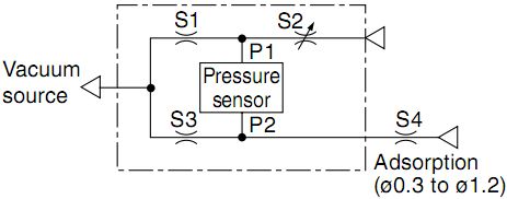 下图是小孔口吸着确认型真空压力开关的工作原理图:图中S4代表吸着孔口的有效截面积,S2是可调针阀的有效截面积,S1和S3是吸着确认型开关的内部孔径,S1=S3.工件未吸着时,S4值较大。调节针阀,即改变S2值大小,使压力传感器两端压力平衡,即p1=p2。当工件被吸着时,S4=0,出现压差p1-p2,被压力传感器检测出。