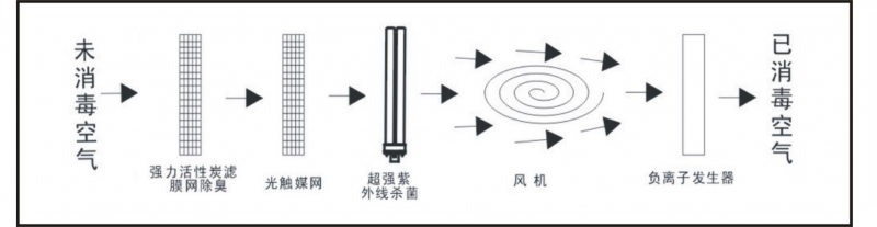 本产品主要采用循环风高强度紫外线杀灭和去除空气中常见细菌及致病微生物达到消毒要求。