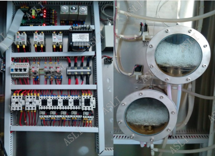 2、淋雨系统:设备的淋雨系统由水泵,时间继电器,喷嘴等组成部分,喷洒週期可调。