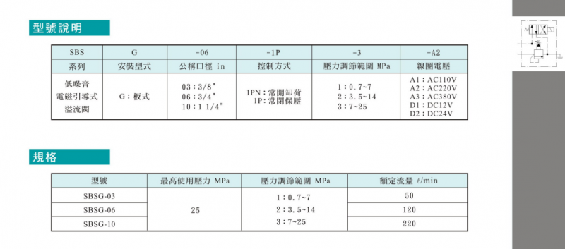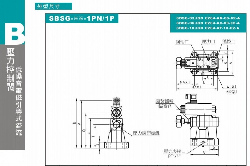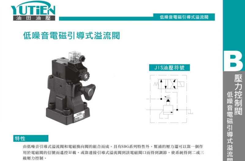 由低噪音引导式溢流阀和电磁换向阀的组合,具有SBG系列特性外。油泵的压力还可以靠一个作用于电磁阀的信号而遥控卸载,或靠连接引导式溢流阀到该电磁阀口而得到调节。使系统得到二或三级压力的控制。