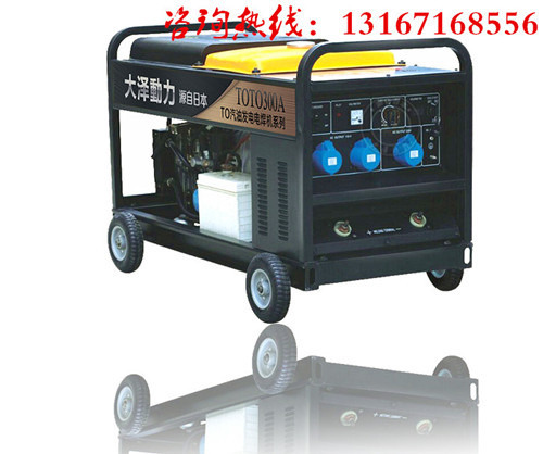 自发电电焊机,300A汽油发电电焊机,大泽动力焊机额定功率:5kw,额定电流300A,额定电压220V,电流范围80-300A,使用焊条3.0-7.0发电机额定功率5KW,单三相。显示清晰的面板及操作简便的各类开关,简单易行;大泽原装发电电焊机,输出功率大,耗油低;使用大型油箱,保证长时间运转;采用大型消音器和大型空滤器,大大减低噪音。自发电电焊机,300A汽油发电电焊机广泛应用于油气田、管道、炼化、铁路、市政抢修、施工等行业。原装大泽动力300A汽油发电电焊机,这款发电电焊机,是微调的,电流从80~300a。,可以长态焊6.0焊条,。配有手推车,移动方便,易于携带!额定功率5KW一机双用性能负载性能%100。