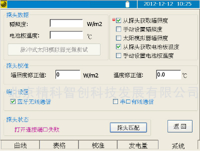 环境参数获取方式灵活多样,提供了从太阳幅照度计获取数据或手动设置功能,并额外提供了脉冲式太阳模拟器光强测试功能。由于日常使用环境的变化,对太阳幅照度计的测试数据会产生一定影响,为用户贴心设计了修正系数设置。太阳幅照度计与主机的连接方式也有蓝牙与串口连线两种选择方式。