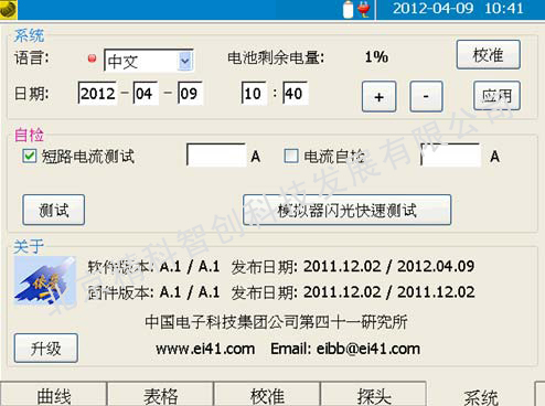 系统界面提供了多国语言选择,目前提供了中文与英文两种语言界面。系统界面还提供了日期与时间设置功能,方便校时。另外提供了附带的短路电流测试功能,能够快速测试被测阵列的短路电流。模拟器闪光快速测试是本仪器的一项独特功能,能够利用瞬态模拟器进行组件伏安特性测试。本界面还提供了系统软件升级功能,能够方便的通过USB盘进行系统升级。在本界面中提供对远程监控的设置功能。