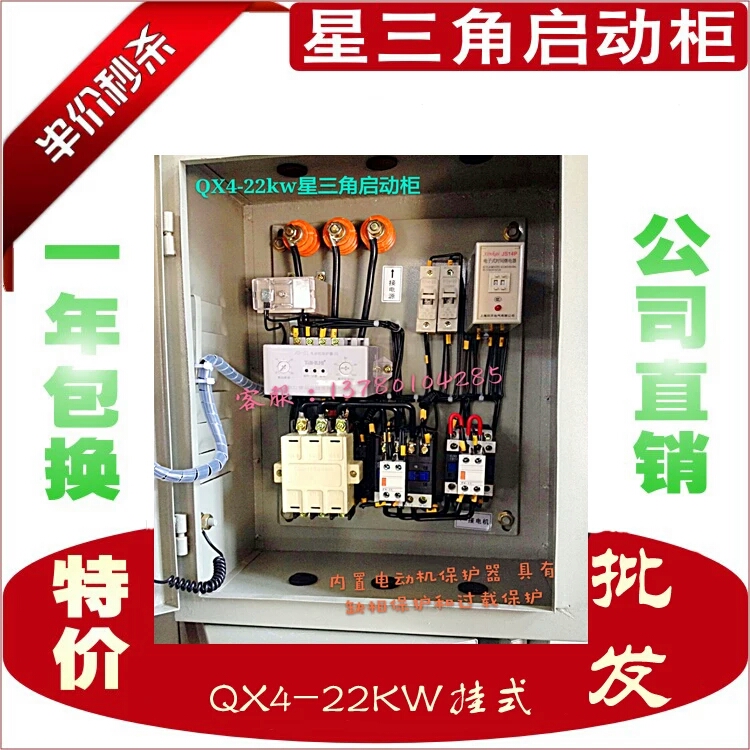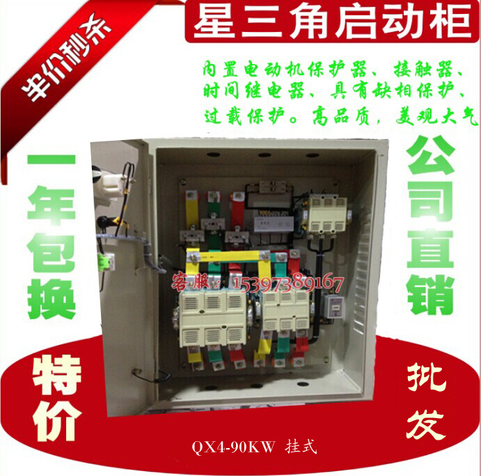 适用于55KW以下电机,由交流接触器 3只、热继电器 1只、时间继电器 1只、指示灯 3只,按钮2只,电压表 1只,电流表 1只,互感器 1只。