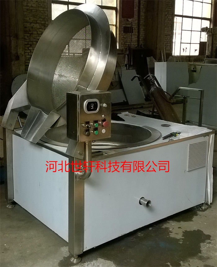 该设备主要应用于花生、芝麻、辣椒、香菇、即食菜等物料的油炸操作。采用电磁或者燃气两种加热方式。油炸过后的渣料可通过漏网框翻转倒出,油料则通过锅体底部放出。为提高油炸效果,在漏网框上部加装搅拌装置,为保证生产工艺,加装温度测量与控制装置。