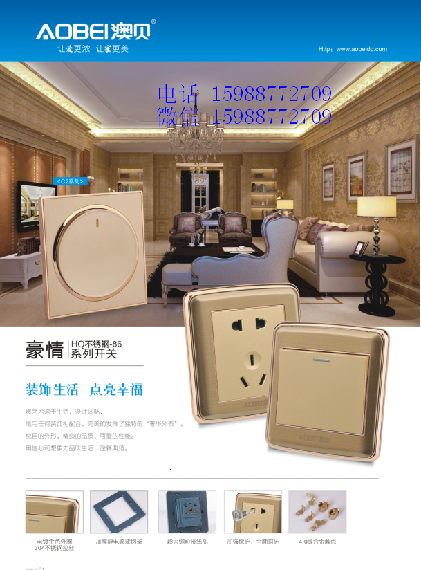 澳贝电器科技有限公司 主营产品介绍:墙壁开关、开关插座、工程开关、宾馆开关、酒店开关、调光开关、调速开关、门铃开关、触摸开关、声光控延时开关、人体红外感应开关、电话插座、电视插座、电脑插座、断路器、防水盒、地板插座、英式开关插座、英式插头、欧式转换插头、刮胡插座、声控灯头、三相四线插座等
