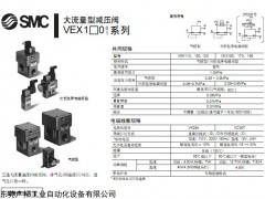 SMC带速度控制阀和电磁换向阀的减压阀VEX5系列:VEX5系列减压阀是在VEX1大流量减压阀的基础上,增设了2个或3个电磁换向阀和一个速度控制阀组合而成的复合阀。除功能多外,还具有功率大、经济的特点。