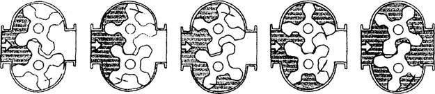 流量计对流体流量的测定是在计量腔体内完成的。一对螺旋转子在液体的压力下转动,转子与计量腔壁间形成的封闭空间(图阴影部分)每回转一次排出8倍阴影体积。因此根据这一关系,只要计量转子回转的次数,即可计算出流量累积量,根据每秒的转数,即可测出瞬时流量。