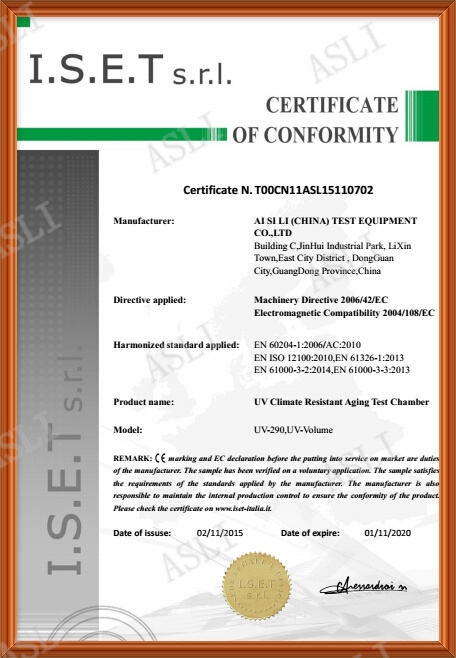 随着产品销售规模的不断扩大及市场的重新定位,二00六年广东艾思荔检测仪器有限公司在华南广东成立了;同时华东工厂关闭,并保留其售后服务团队,使其拥有无可匹敌的服务优势、质量优势、充满活力的经营团队,专业完善的客服体系,以及精湛的制造工艺和创新的研发思路,在现代guo际化、标准化、专业化的质量政策下,艾思荔将逐步迈向guo际品牌之路。仪器符合行业标准:CNS、JIS、ASTM、ISO、DIN、BS、MIL/STD、NACE、AATCC、SAE、IEC、UL......均为所用。