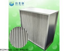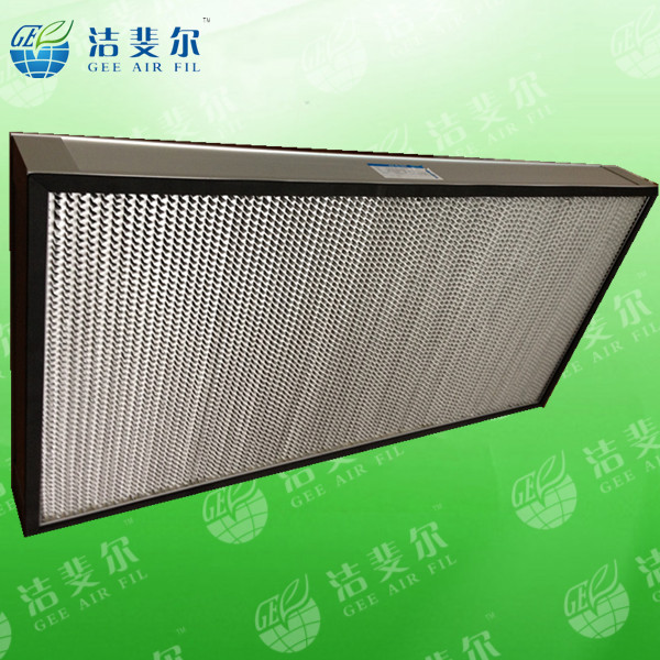 1.:超细纤维作滤料、优质牛皮纸热滚压成形或采用胶版纸、铝铂作分隔板,与木框或铝合金框胶和而成,具有过滤效率高,阻力低,风量大的优点。目前,多采用双面上胶的铜版纸作分隔板,目的是为了防止分隔板受冷热干湿的影响发生收缩,从而散发颗粒。但在温湿度发生变化时,隔板纸可能会有较大颗粒散发,