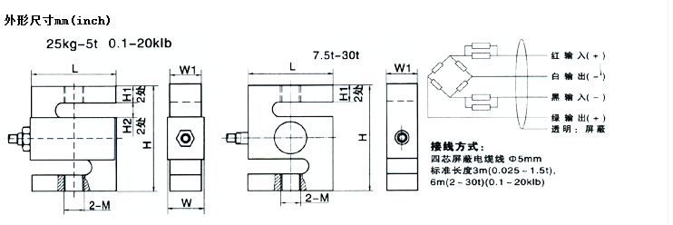 ◆合金钢材料,镀镍,S型结构,胶封,拉向或压向承载。 ◆防护等级IP67 ◆适用于吊钩秤、机改秤、料斗秤等各类电子称重设备。 推荐选择型号: xxkg | C3/C4/A5S/B10S | H3-xx-xxkg-3B | xxt | C3/C4/A5S/B10S | H3-xx-xxt-xB | xxlb | A5S/B10S | H3-xx-xx-6YB | xxklb | A5S/B10S | H3-xx-xxk-6YB | 20klb | C3 | H3-C3-20k-6YB | 100kg-600kg通过OIML C3级认证 100kg-2.5t通过OIML C3/C4级测试 50kg-7.5t(100lb-15klb)通过NTEP A5S/B10S级认证。 | 技术指标 额定载荷 | t | 0.025/0.05/0.1/0.25/0.5/0.75/1/1.5/2/2.5/5 | lb | 100/150/200/250/500/750/1K/1.5K/2K/2.5K/3K/5K/7.5K/10K/15K/20K | 精度 | | C3 | C4 | A5S | B10S | zui大检定分度数 | n max | 3000 | 4000 | III5000单只 | III10000单只 | zui小检定分度值 | v min | Emax/10000 | Emax/14000 | Emax/15000 | Emax/10000 | 综合误差 | (%FS) | ≤±0.020 | ≤±0.018 | ≤±0.018 | ≤±0.035 | 蠕变 | (%FS/30min) | ≤±0.016 | ≤±0.012 | ≤±0.012 | ≤±0.030 | 温度对输出灵敏度的影响 | (%FS/10℃) | ≤±0.011 | ≤±0.009 | ≤±0.009 | ≤±0.030 | 温度对零点输出的影响 | (%FS/10℃) | ≤±0.015 | ≤±0.010 | ≤±0.010 | ≤±0.030 | 输出灵敏度 | (mv/v) | 2.0±0.004(公制) 3.0±0.008(英制) | 输入阻抗 | (Ω) | 350±3.5 | 输出阻抗 | (Ω) | 351±2 | 缘阻抗 | (MΩ) | ≥5000(50VDC) | 零点输出 | (%FS) | ≤±1.5(公制) ≤±1.0(英制) | 温度补偿范围 | (℃) | -10~+40 | 允许使用温度范围 | (℃) | -35~+70 | 推荐激励电压 | (V) | 5~12(DC) | zui大激励电压 | (V) | 18(DC) | 安全过载范围 | (%FS) | 150 | 限过载范围 | (%FS) | 300 | | ATEX等级(可选) | | II1G Ex ia 1C T4 | II1D Ex ia D20 T73℃ | II3G Ex nL IIC T4 |   量程 | H | L | W1 | W | H1 | H2 | M | 25kg,50㎏ | 76.2(3.0) | 50.8(2.0) | 12.7(0.5) | 16.1(0.63) | 15.7(0.62) | / | M8 | 0.1t~0.15t | 76.2(3.0) | 50.8(2.0) | 19.0(0.7) | 22.4(0.88) | / | 9(0.35) | M10×1.5 | 0.2t~0.75t | 76.2(3.0) | 50.8(2.0) | 19.0(0.7) | 22.4(0.88) | / | 9(0.35) | M12×1.75 | 1t,1.5t | 76.2(3.0) | 50.8(2.0) | 25.4(1.0) | 28.8(1.13) | / | 9(0.35) | M12×1.75 | 2t~5t | 101.6(4.0) | 76.2(3.0) | 25.4(1.0) | 28.8(1.13) | 20(0.79) | / | M20×1.5 | 7.5t,10t | 175(6.9) | 125(4.9) | 50(1.97) | / | 41(1.61) | / | M33×3 | 15t | 200(7.9) | 160(6.3) | 60(2.36) | / | 39.5(1.56) | / | M42×3 | 20t | 200(7.9) | 160(6.3) | 60(2.36) | / | 51(2.01) | / | M42×3 | 30t | 230(9.1) | 190(7.5) | 80(3.15) | / | 57.5(2.26) | / | M42×3 | 100lb~300lb | 63.5(2.5) | 50.8(2.0) | 12.7(0.5) | 15.9(0.63) | / | 8.25(0.32) | 1/4—28UNF | 500lb-1.5klb | 63.5(2.5) | 50.8(2.0) | 19.05(0.75) | 22.25(0.88) | / | 8.25(0.32) | 1/2—20UNF | 2klb,2.5klb | 63.5(2.5) | 50.8(2.0) | 25.4(1.0) | 28.6(1.13) | / | 10.16(0.4) | 1/2—20UNF | 3klb | 101.6(4.0) | 76.2(3.0) | 25.4(1.0) | 28.6(1.13) | / | 15.24(0.6) | 1/2—20UNF | 5klb,10klb | 101.6(4.0) | 76.2(3.0) | 25.4(1.0) | 28.6(1.13) | / | 15.24(0.6) | 3/4—16UNF | 15klb | 139.7(5.5) | 101.6(4.0) | 31.8(1.25) | 35(1.38) | / | 16.4(0.65) | 1—14UNS | 20klb | 177.8(7.0) | 127(5.0) | 50.8(2.0) | 54(2.13) | / | 21.5(0.85) | 5/4—12UNF | |