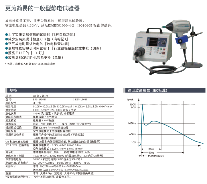 ESS-B3011 / L1611 & GT-30R产品描述:特征●为了实施更加信赖的试验的『3种自检功能』●减少安装失误『检查CR值(有标记)』●空气放电时确认放电的『放电检查功能』●更加轻松实现长时间试验!『行业轻量级的放电枪(调查)●照亮EUT的『LED灯』●放电盒和CR组件也容易更换(单键)