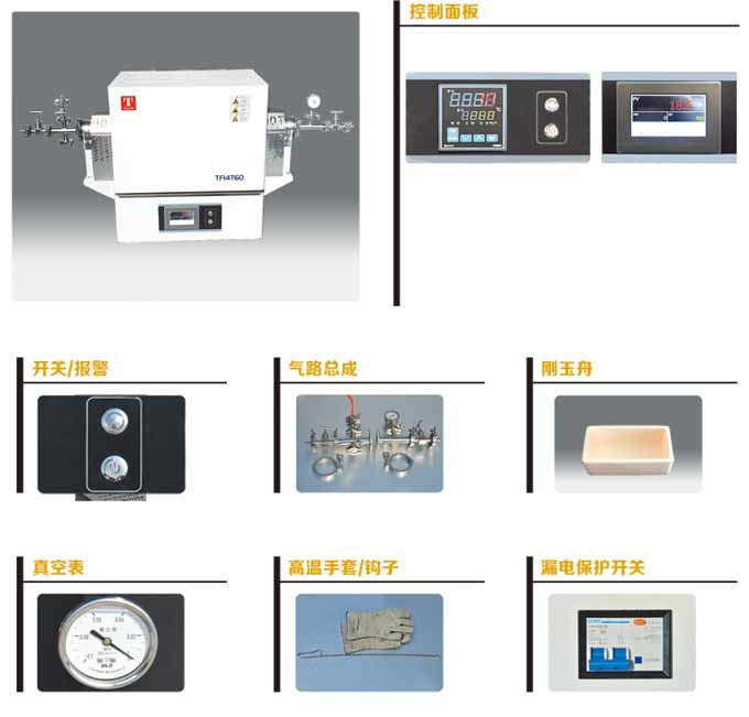 气路总成一套(含真空表)、高温手套1副、刚玉管1根、刚玉堵2个、刚玉舟2个、钩子1把