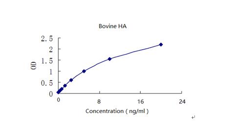 本实验采用双抗体夹心ELISA法。所提供的ELISA Kit是典型的夹心法酶联免疫吸附测定试剂盒(ELISA)。预先包被的抗体为抗牛HA单克隆抗体。检测相抗体为多克隆抗体,经生物素(biotin)标记。样品和生物素标记抗体先后加入酶标板孔反应后,PBS或TBS洗涤。随后加入过氧化物酶标记的亲和素反应;经过PBS或TBS的彻底洗涤后用底物TMB显色。TMB在过氧化物酶的催化下转化成蓝色,并在酸的作用下转化成终的黄色。颜色的深浅和样品中的待测因子呈正相关。