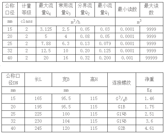 逸海卓诚牌接触式IC卡智能水表外观尺寸及流量参数: