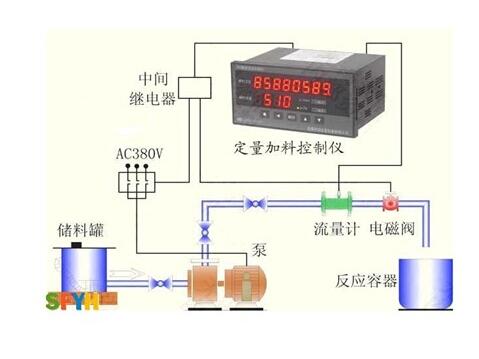 二、液体定量控制仪控制过程 定量控制仪在接收了流量计的流量信号后,在其内部完成流量的累计,同时在控制仪内部设定好所需要的定量控制值,当定量控制仪显示的累计数值达到所设定的定量控制值时,定量控制仪输出开关量信号。此时利用该开关信号通过配接继电器或接触器来控制安装在管道上的断流设备,从而达到定量控制的效果。