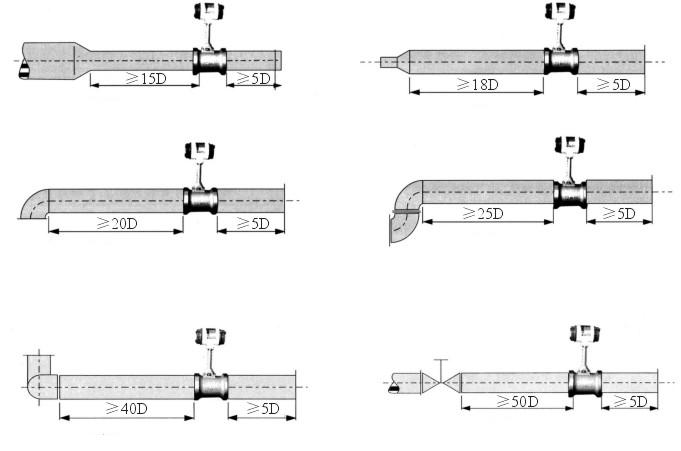 涡街流量计安装与使用: 涡街流量计的安装要求有一定的前后直管段,常见情况如下(D为管道的直径):