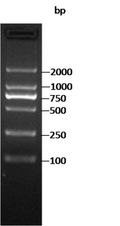 产品描述:本产品仅供科研使用,由2000 bp、1000 bp、750 bp、500 bp、250 bp和100 bp共6条线性的双链DNA组成,其中750 bp的DNA含量约为30 ng/μL,其它5条DNA含量均约为10 ng/μL,本产品已含有1×上样缓冲液,可以直接用于琼脂糖凝胶电泳。