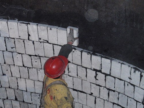 2)、用高压水泵送水,将烟囱的内壁进行清洗,并铲除内壁腐蚀层(塌方的内衬需拆除脱落残余的部分内衬,再按需要砌还),并对烟囱的整个内衬墙进行局部修补;