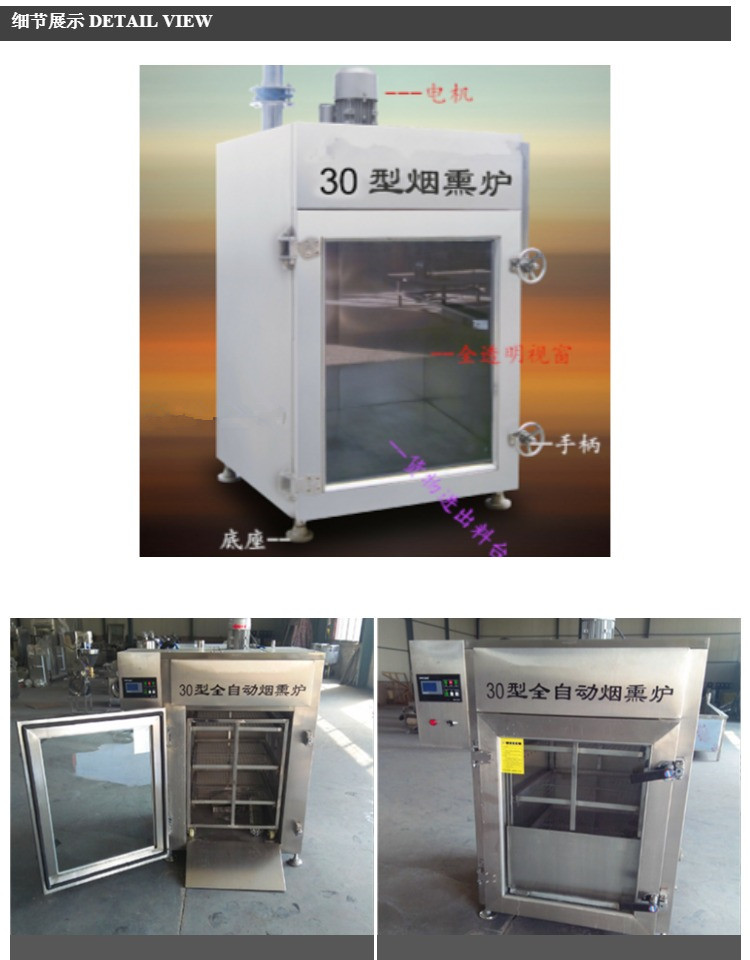 可控温烟熏炉,自动熏烤烘干设备,烧猪炉可控温烟熏炉具有烘干的功能,烤鸡、烤鸭、猪蹄、腊肠等肉制品是烟熏不可缺少的设备。自动熏烤烘干设备的触摸屏,可编程控制器及继电器,电磁阀等关键电气元件均采用进口产品。