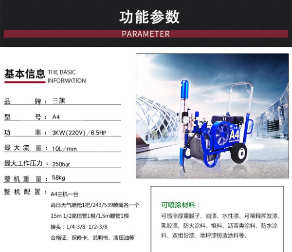 上海三旗喷涂设备有限公司——全球高端涂装设备供应商 上海三旗喷涂设备有限公司位于中国第一大城市上海,成立于2009年,是经国家相关部门批准注册的机械及行业设备企业,公司集科研、生产、销售为一体,是中国涂装设备制造的领先者和主要供应商。 公司引进欧美先进的高压无气生产技术和输送泵技术,同时结合国内建筑需求,生产出稳定性高、工作效率高、操作简单的高压无气喷涂设备和螺杆泵设备。主要产品有GH833、GH933、GH2570、GH5040、GH300、HC970、HC960、MAX10、MAX20、HM4000、划线机等多种型号的高压无气喷涂设备及新一代砂浆机、腻子喷涂机、厚型防火涂料喷涂机、真石漆喷涂机、界面剂喷涂机等螺杆设备,同时三旗系列产品也荣获国家多项专利,其产品性能已达到国内外领先水平。 公司产品系列丰富,每一种喷涂的材料都有适合的机器。产品广泛应用于中国的钢结构、建筑工程、C型钢、大型车站钢结构、大型道路立交钢结构路面、船舶、机械、交通设施、桥梁、隧道、管道、泵管、油罐、起重设备、地坪、集装箱、风电设备、除尘设备、矿山设备、压力容器、彩瓦、建筑内外墙、家具、货架、钢铁厂高炉内壁、管道内壁、皮革、冶金、钢铁、水利、电力、公路、电器、仪表、科研、轻工、医药、食品、广播电视、石油化工、海洋工程、航天、航空、国防、国家重点工程、涉外工程等各个涂装领域。