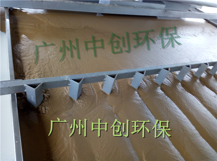 洗沙污泥经过絮凝混合器后进入布料装置,由导流跟溢流板、平流板,侧挡板洗沙场洗出来的泥浆水均匀分布在 重力浓缩段上: