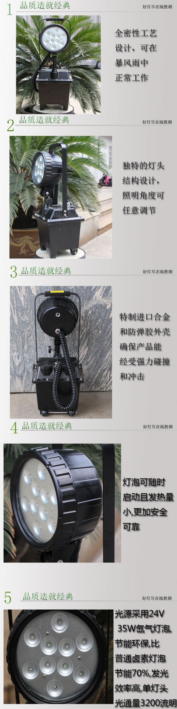 独特的灯头结构设计,照明角度可任意调节,装有方便移动的轮子和提手,操作简单。
