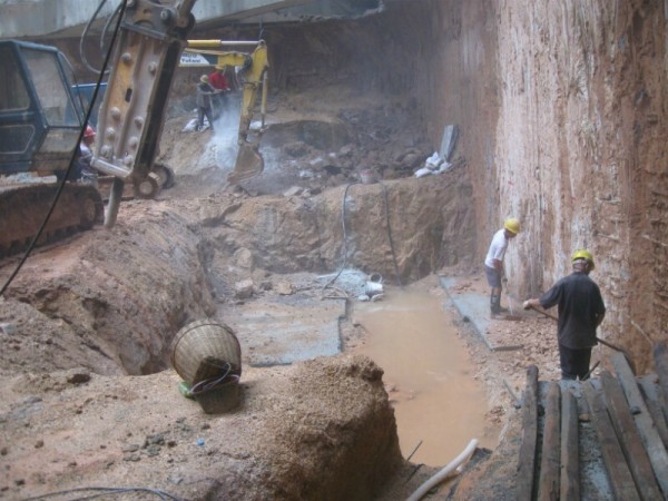 2)打孔:先在岩石上用风钻钻孔,每间隔0.5米垂直打孔,在横截面上凿深度为40~50公分的孔,为提高工作效率,凿孔的作业可提前进行;