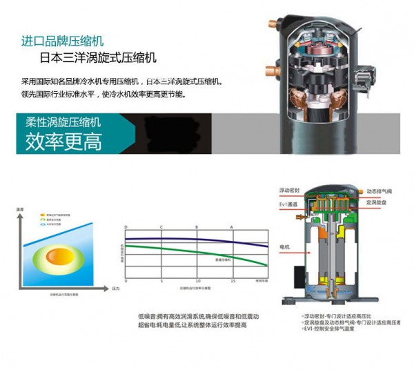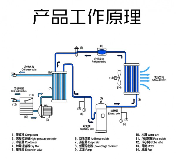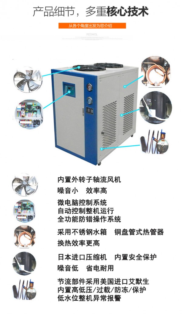 1. 风冷冷水机,通过自身吸入冷空气,排出热空气,散热无需外接散热塔,安装、移动方便。主机采用欧美日进口压缩机,内置安全保护,运行可靠,效率高,噪音低,省电耐用,使用寿命长。
