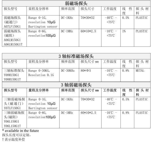 德国柯雷公司的 G100 手持式高斯计,是总结了高斯计几十年的发展经验,经过人体工程学设计,并采用的新的电子技术设计制造出来的。 G100 手持式高斯计可用于大专院校,实验室,工业,制造业和各种应用。其采用 3.2 英寸彩色 LCD 显示屏,典型精度为读数的±0.8%,磁场可检测频率范围从 DC 到 30KHz,量程高达 100KG(10T)。G100 高斯计提供大容量数据存储及数据阅读功能,并可上传到电脑保存并分析。探头采用仪表级砷化镓 Hall 传感器,温度系数<0.03%/℃,传感器有源区直径仅 0.15mm,大大提高磁场的空间分辨率。主机可以同时接入 3 个探头,分别测量不同位置的磁场并显示在屏幕上,多探头的应用可大大节省客户的使用成本。探头电缆长可达 100 米,将来还有无线探头,方便了客户的使用。MKY-G100 手持式高斯计可同时显示多种测量参数:磁场强度、时域波形图、zui大值、zui小值、峰值、磁场频率。如果是三维探头,还可以同时显示矢量值和XYZ分量值。主机带模拟输出(±3.0V)和USB接口。用户可选配多种类型的探头:轴向探头,径向探头,高温探头(zui高温度+155°),超薄探头,弱磁场探头和三维探头。探头内置校验日期提醒功能,每次插入探头的时候,主机可提醒用户下一次校验的时间,以保证仪器的精度。每个探头内可存储3000个数据,主机可以命令探头以1秒-999秒的间隔连续存储数据。即使拔出探头,存储数据也会保存在探头内。