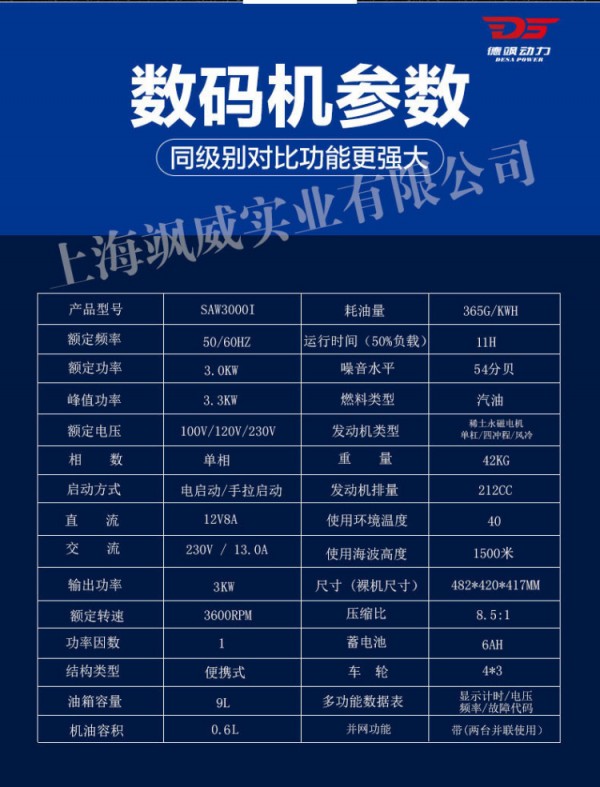 德飒静音数码变频汽油发电机产品特性:省油:优良的燃烧效率产生高的经济效益。宁静:无论何时何处都能使用的低噪音发电机。可靠:稳定的电压自动调节系统和机油警告系统,令人放心使用小型汽油发电机,家用发电机组,家用汽油发电机,学校应急发电机组,耗油汽油发电机,施工照明汽油发电机,电压稳发电机,实验专用汽油发电机,手提式汽油发电机产品用途:家庭照明,实验用,办公应急,商店应急,超市应急,野外旅游,工程应急,户外应急用小型汽油发电机,移动电站应急汽油发电机,通信机房用小型汽油发电机,别墅应急小型汽油发电机,上海多燃料小型汽油发电机。推荐理由:不一般的操作设计,简单易行,耗油量低,经济实用,经久耐用,可靠性高,省却繁琐的维修保养,配有保护装置,确保运作安全,采用静音防震设计。本款机器体积小,简单易行,耗油量低,经济实用,便于携带,价格实惠,是家用应急及一些小型服务场所照应急设备的不二之选。20千瓦静音汽油发电机,引进德国的技术,外形独特,耗油低,节油控油,质量过关,拥有各项证书,可检验,技术研究生产,长期与中铁工程公司,海洋工程公司,国外工程施工公司,移动联通营业厅,气象局及所有家庭用户,企业用户,个人用户等合作。设备都为汽油性,主要优点是:低耗油、超低噪音,在同等机型中经济实用,公司租赁、销售价格合理!可广泛应用于公路、铁路、工厂、医院、船舶、大厦、通讯、矿山、、管道清洗、工程机械等领域,是施工单位、租赁公司或个人的理想之选!在每一个家庭,在每一个工厂,在城市的上空或地下在辽阔的海洋,电推进人类的发展原声只能在的各个角落都被积广泛的应用,它凝聚了光明,输送了动力,促进了沟通奏响了光明活力的乐章德飒动力重用自己专业的技术和初重的质量,从事发电机研发及生产销售及一身: 我公司是上海一家长期生产销售发电机系列产品数码变频发电机自动变频发电,具有发电非常稳定、超小体积、超小重量、超低油耗、手提式便携带、四冲程纯汽油发电机超低排量等一系列,是发电机机产品中的数码产品,发出电流比家用市电更加稳定(家用市电千分之七千伏安,德飒动力数码变频发电机千分之三千伏安,波动非常小性能稳定),适合带动一些仪器、野外车旅、登山野营、户外手提用电用户的一选择! 数码变频发电机自动变频发电,具有发电非常稳定、超小体积、超小重量、超低油耗、手提式便携带、四冲程纯汽油发电机超低排量等一系列,是发电机机产品中的数码产品!德飒动力数码变频发电机分成2部分:一部分是发电机部分,一部分是逆变控制部分。发电机部分主要是3相小型汽油发电机,该部分是发电机的主要部分,负责产生电能,发电机部分是一个单纯的电能产生部分,我们只要选择对应功率的发电机绕组就可以。第二部分就是控制部分。