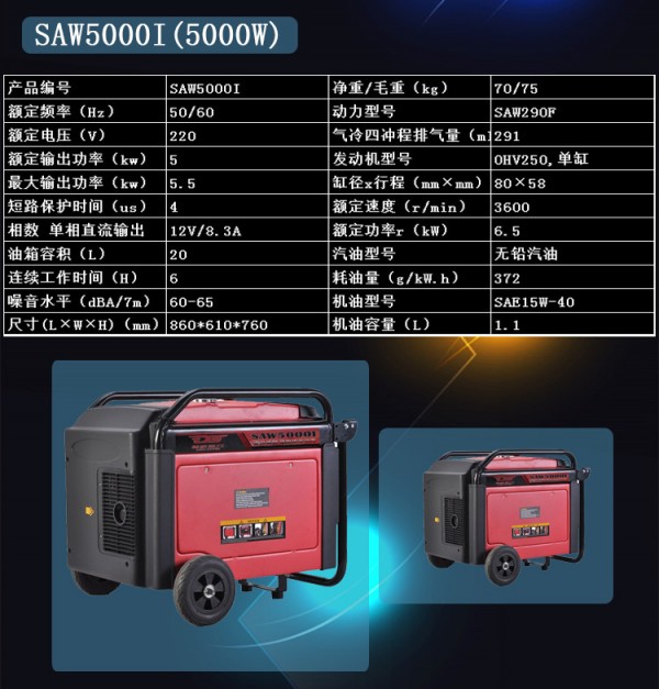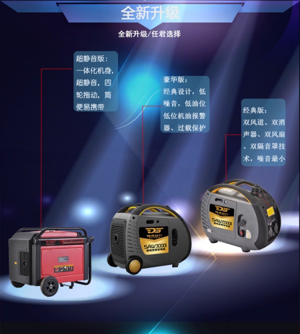 德飒动力数码变频发电机:方便&轻巧数码变频发电机是其发电设备中zui小的一款。与传统发电机组相比,它的尺寸和重量都减小了50%左右,这使得它可以作为小型便携式电源应用于许多场合,彻底改变了发电设备在消费者心目中的“大,笨,粗”的传统形象。独特结构&工艺数码变频发电机组外观设计新颖美观,内部工艺结构独特合理,并同时拥有外观设计及内部结构等相关.安静&惬意设计独特的双层降噪系统使得数码发电机组的噪声要比传统发电机组低3-9分贝。它采用知名专业设计公司所设计的风道,使得进气排气更为通畅,噪声和机械振动更小。优质&稳定数码变频发电机的关键部件是其内置式微处理器,配合功能强大的模块化设计,它会对发电机产生的原始电力进行处理、净化,使得数码发电机组的电力输出是非常洁净和平稳。这部分主要实现2个功能:一是逆变出所需要的交流电源,第二就是通过油门控制发电机的功率输出。要让这个发电机部分安全理想的工作和发送出我们需要的电能,这个就是逆变控制部分的任务。该产品为创,填补了空白,相关技术拥有多项科技;生产和研发实力雄厚,售后服务完善。该产品适用于野外作业、远足野营、岗亭哨所、家居、商店设施提供临时应急的电源。德飒动力数码发电机通过了CE, GS, EPA. CARB,CSA等产品认证,产品完全符合“绿色、环保、低消耗”的特点,有很强的市场竞争力。用单缸风冷四冲程汽油机为动力,具有马力足、结构设计合理、持久耐用、便于维护等特点,该系列发电机组感性负载好,稳态及动态过程电压、频率其稳定,适用于普通及高精仪器电源场所使用。适合带动一些仪器、野外车旅、登山野营、户外手提用电用户的一选择!服务承诺:本公司秉承“产品如人品,先做人后做事,一切为用户着想”等经营理念,现对产品服务工作郑重承诺:一、技术服务:派员到现场作技术指导,协助搞好机房设置,调试,替用户制订培训计划、(工厂或现场)培训操作人员,双方商量培训方式,内容及时间,按照实际情况而定。二、配件服务:三包期内提供部分易损件,三包期外长期供应零配件和技术支持。三、维修服务:用户在使用中如出现产品任何故障,将随时派员到现场服务,公司凭经销公司或用户单位的维修报告及产品证明书,本省12小时安排落实到位,外省24小时以内安排落实到位,三包期为壹年或运行1000小时(以先到为准),终身服务.四、服务原则:产品在使用中,如出现故障,公司可派员现场服务,确保及时运转。