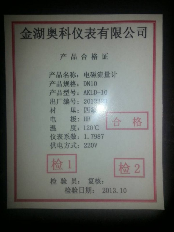 奥科仪表碱水流量计说明书及产品合格证
