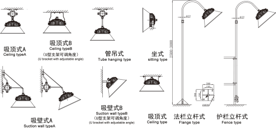 安装方式:A:吸顶式 b:管吊式 c:吸壁式 d:法栏立杆式 e:护栏立杆式