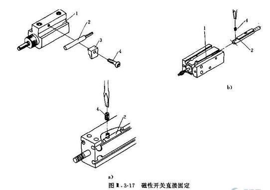 SMC带磁性开关气缸开关壳体上有一带孔的夹片,导轨中有一可滑移的安装螺母,将安装螺钉穿过夹片孔,对准螺母拧紧,则开关便紧固在导轨上。这张安装方法通常用于中小型气缸及带安装平面的气缸。