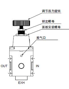 压力设定朝减压方向(高压低压)进行,可以高度地设定。压力调节后,请用锁定螺母紧固,固定旋钮。