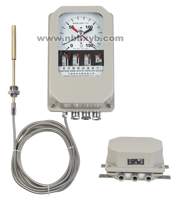 绕组温控器TR(TR=TY+K1TΔ)是在变压器顶层油温TY 的基础上叠加一个附加温升K1TΔ而获得变压器平均温度.其中TΔ是热模拟装置提供的附加温升,K1为与冷却结构有关的系数.绕组对油的温升.TΔ决定于变压器绕组电流.当变压器工作时,电流经变压器电流互感器经仪表的变流器调整后,到绕组温控器弹性元件内的电热元件产生热量使弹性元件位移,从而产生的比油温高一个温度的平均指示值.