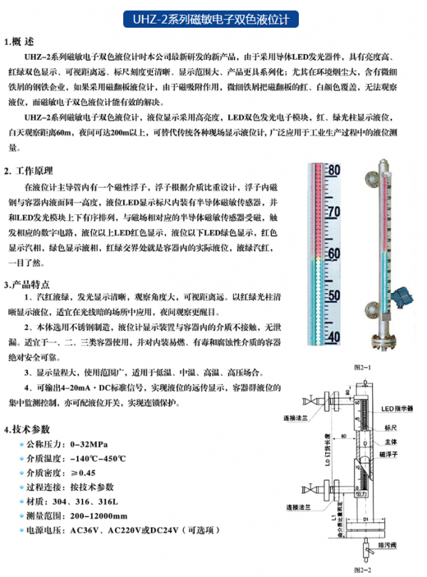 UHZ-2系列磁敏电子双色液位计,液位显示采用高亮度,LED双色发光电子模块,红、绿光柱显示液位,白天观察距离60m,夜间可达200m以上,可替代传统各种现场显示液位计,广泛应用于工业生产过程中的液位测量。