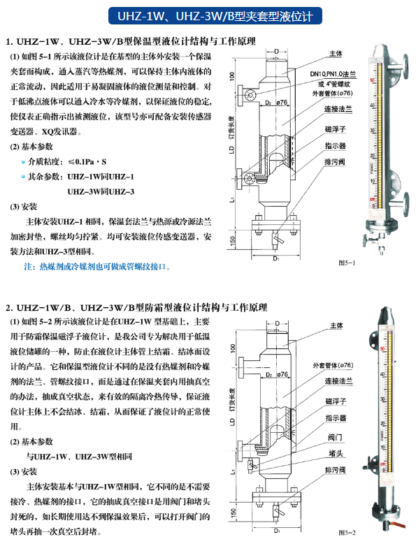 夹套型液位计是在UHZ-1W型基础上,主要用于防霜保温磁浮子液位计,是我公司专门为解决